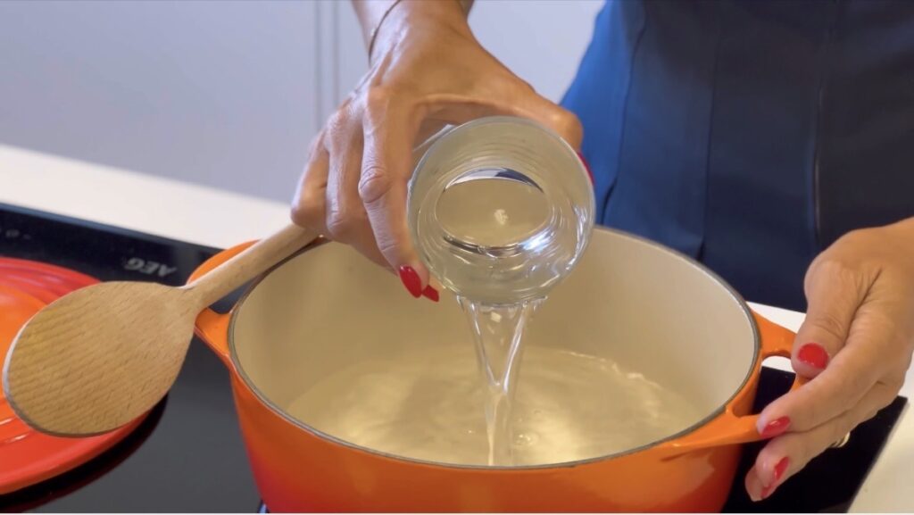 Adicione sempre o arroz à água já a ferver, para não empapar. Este método, conhecido como “cozedura em água abundante”, é fundamental para obter um arroz cozido com grãos soltos e perfeitos. Quando o arroz é adicionado à água já a ferver, os grãos cozem uniformemente sem absorver excesso de água desde o início.