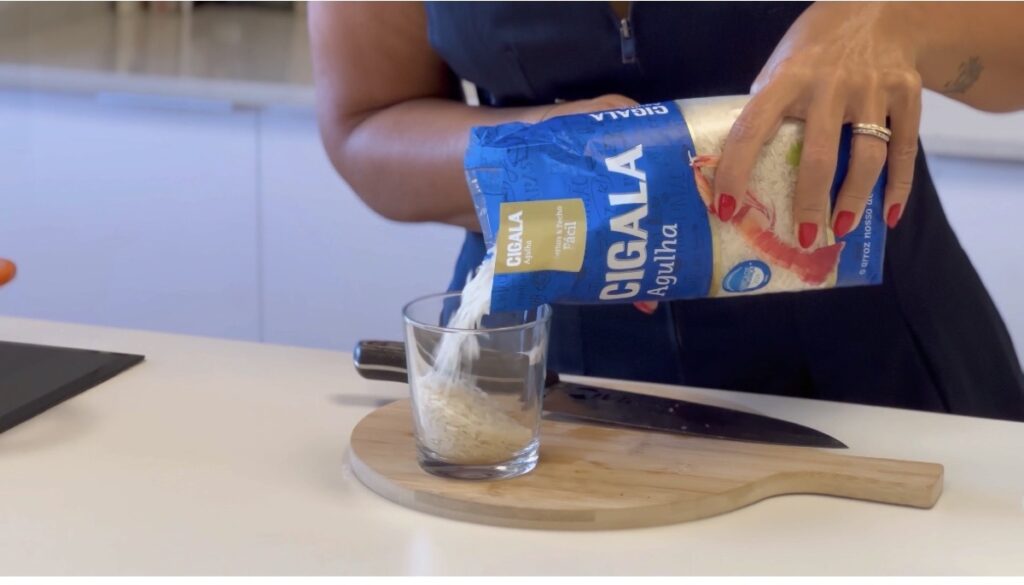 Dica: Para obter um arroz cozido perfeito, use um copo medidor para garantir a proporção exata de arroz e água. O Arroz Cigala Agulha é ideal para esta receita graças à sua textura solta que se mantém perfeita mesmo depois da cozedura. Para mais dicas sobre preparação de arroz, consulte a nossa receita de arroz de frango.