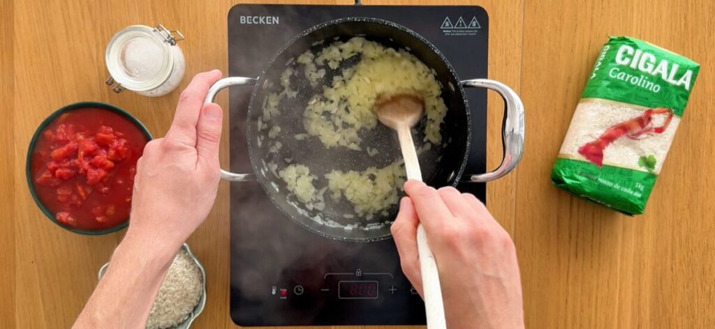 Imagine um prato simples, cheio de sabor e que funciona sempre: o clássico arroz de tomate. A cebola a refogar, o tomate a cozinhar no ponto certo e arroz a ganhar aquela textura perfeita.