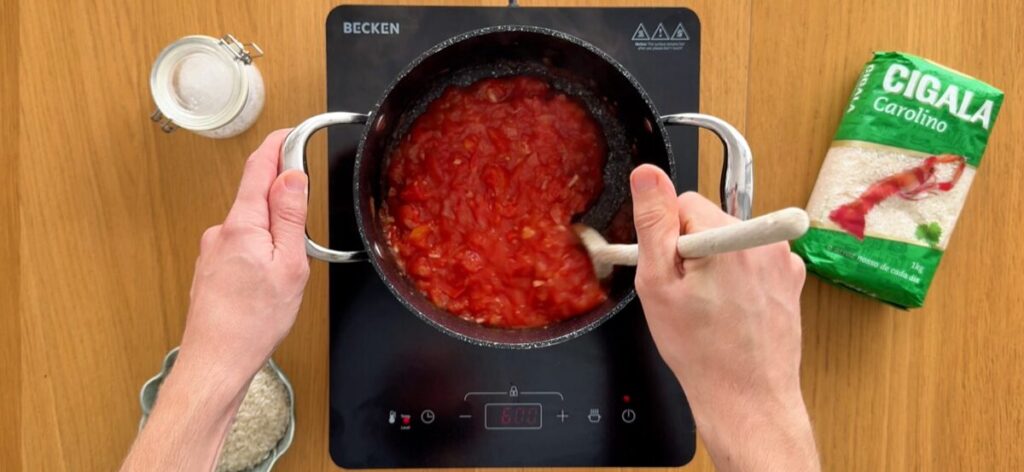 Sim! Opte por retirar as sementes e a pele. Use cerca de 600g de tomate maduro, picado finamente. Coza durante 5 minutos antes de adicionar o arroz para que perca a acidez e desenvolva o seu sabor natural.