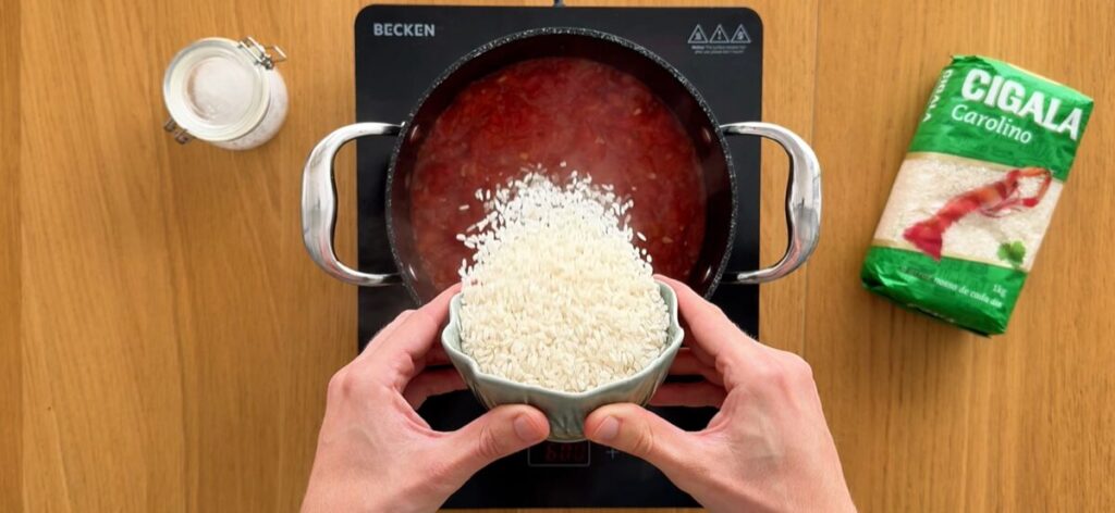 Recomendamos o arroz Carolino Cigala para manter a autenticidade do prato.