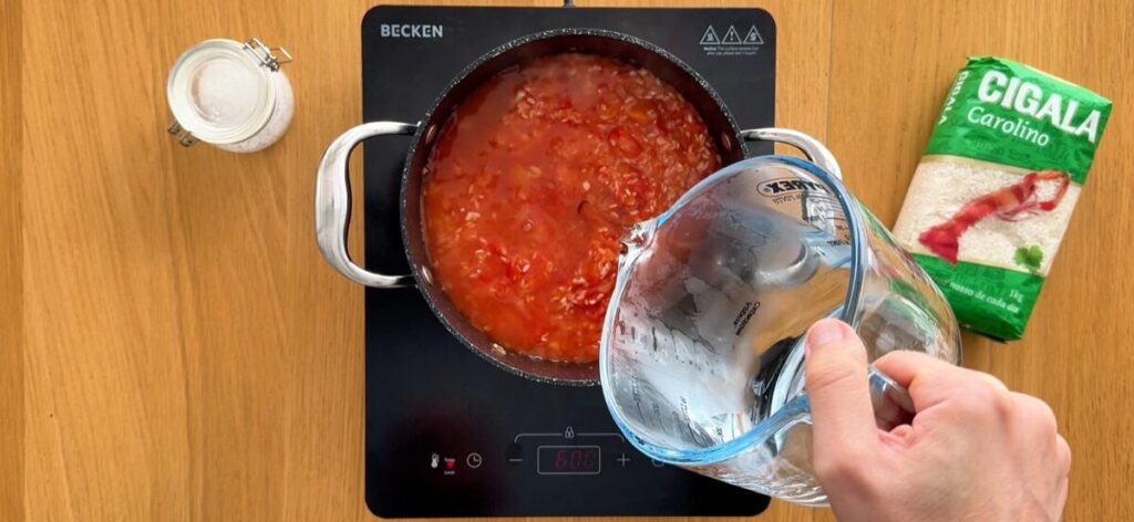 O arroz de tomate espessa ao arrefecer, a água restabelece o equilíbrio.