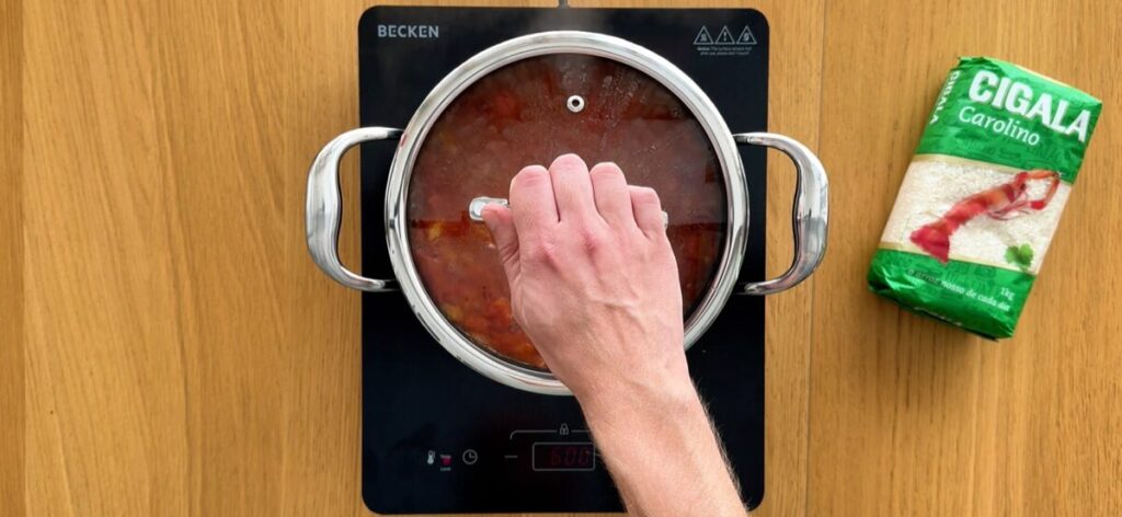 Se o lume for alto, a água evapora rápido, o arroz queima no fundo e o caldo desaparece.
