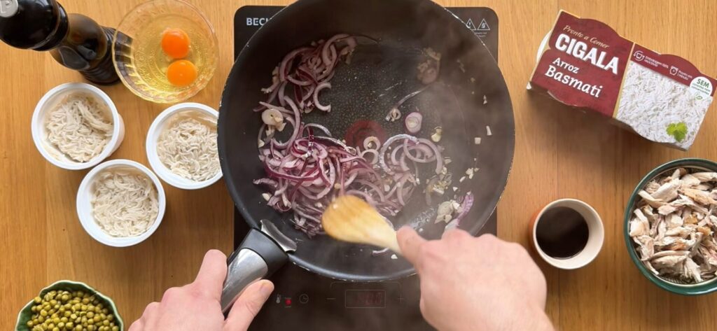 Numa frigideira funda ou wok, aqueça um fio generoso de azeite em lume médio-alto. Adicione 2 dentes de alho picados, ½ dedo de gengibre sem pele picado e 1 cebola roxa cortada em meias-luas. Refogue por 2–3 minutos, até a cebola ficar translúcida e os aromas se libertarem, sem deixar queimar.