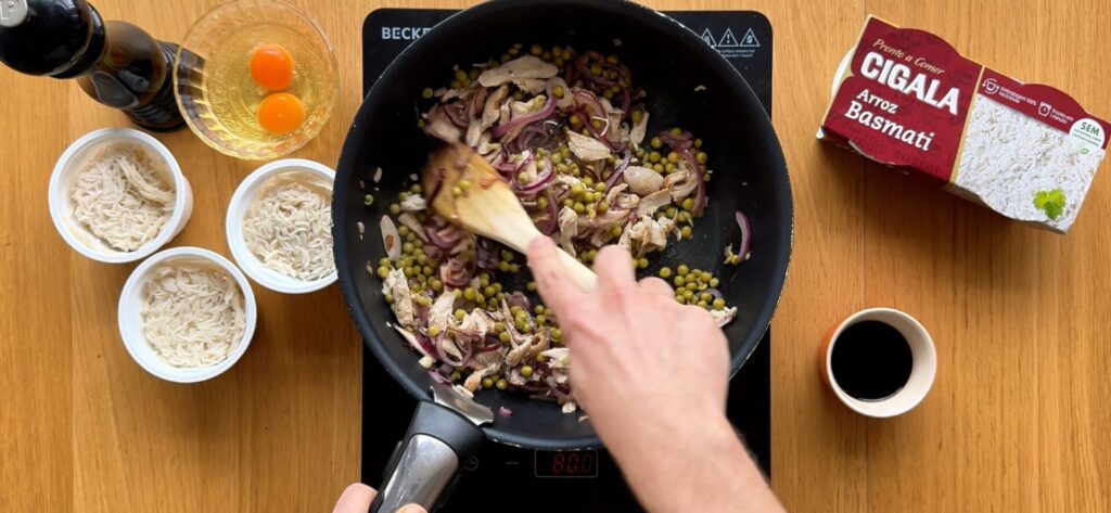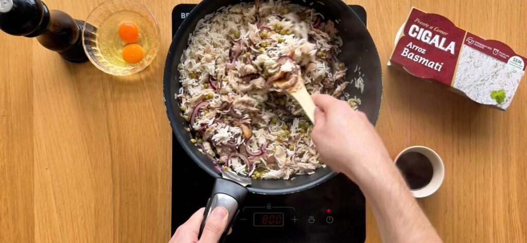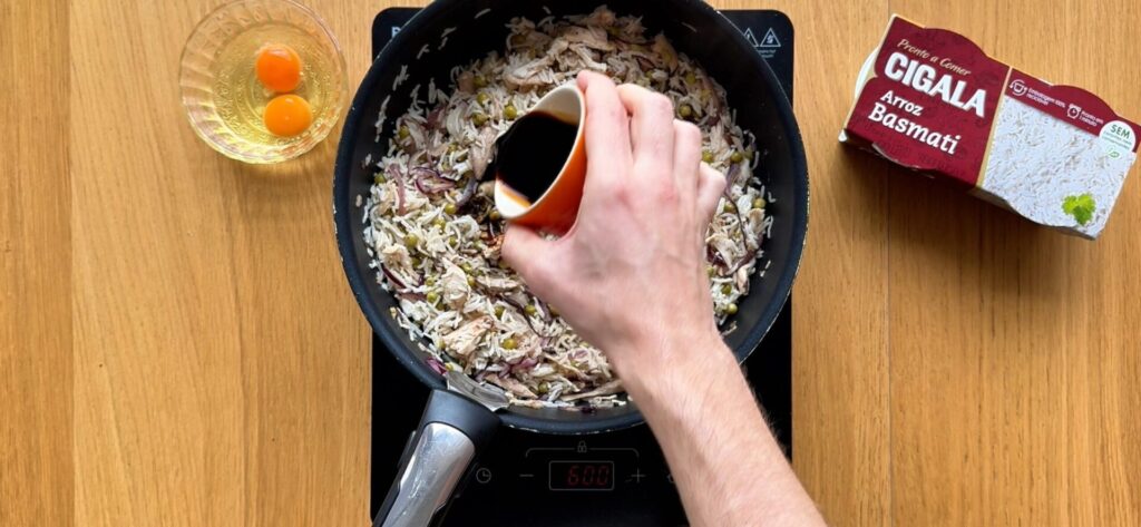 Mesmo com arroz pronto, evite adicionar líquidos em excesso. O molho de soja já contém sal e humidade, use-o com moderação. Se preferir mais molho, opte por molho de soja light ou dilua com um fio de água.