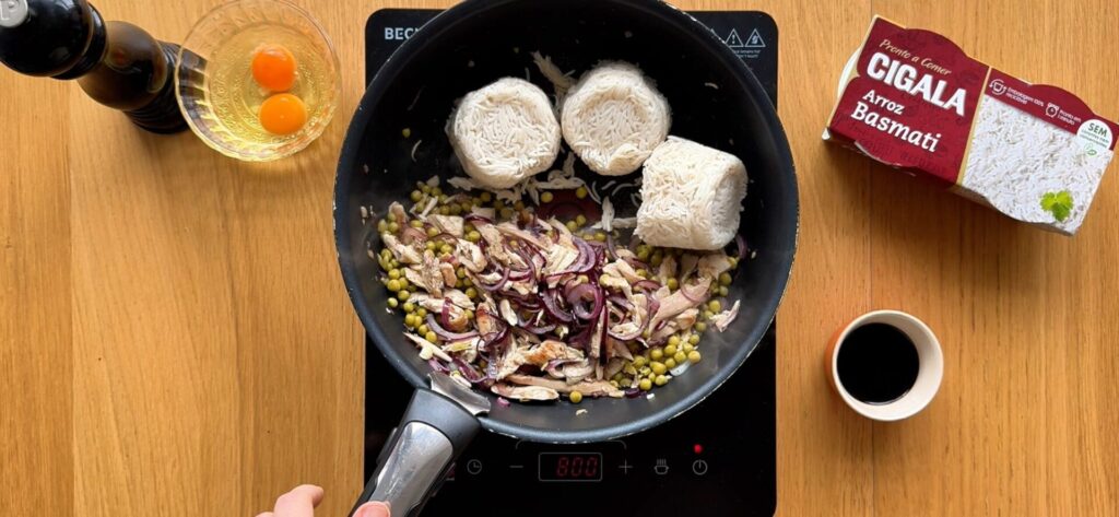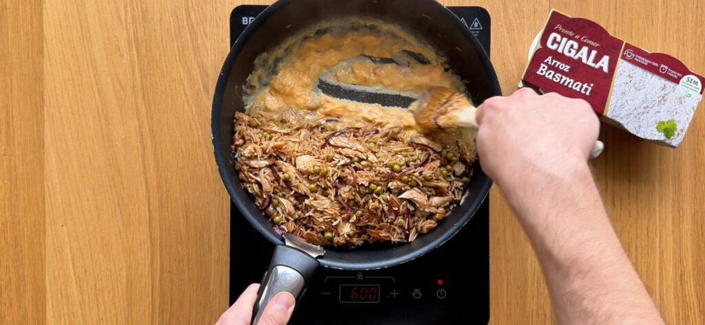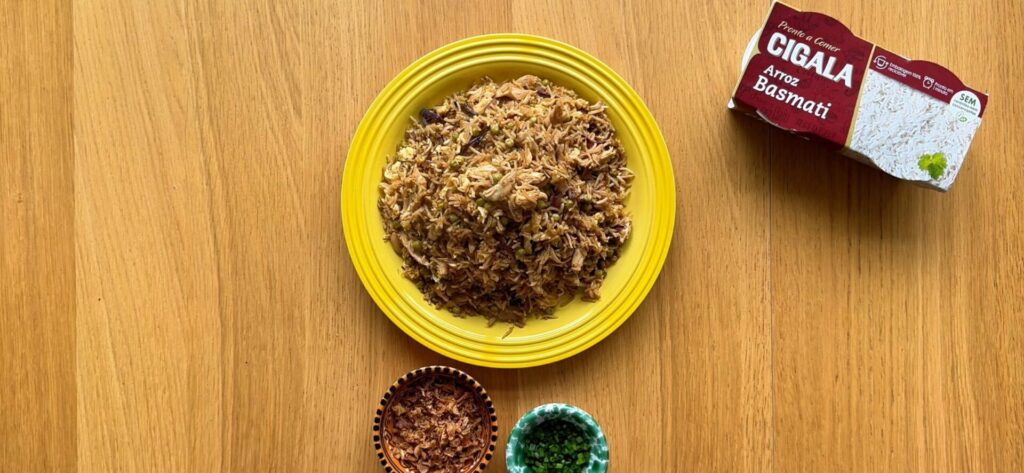 Mas nesta receita, simplificamos tudo: usamos 3 embalagens de Arroz Basmati Pronto a Comer Cigala já cozido, solto e pronto em 90 segundos. Assim, ganha tempo sem perder qualidade. Basta aquecer e integrar!