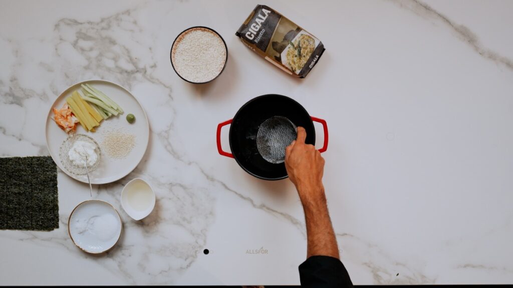 O arroz japonês é tradicional, mas o arroz Risotto Cigala funciona perfeitamente graças à sua textura carnuda e capacidade de absorção.
