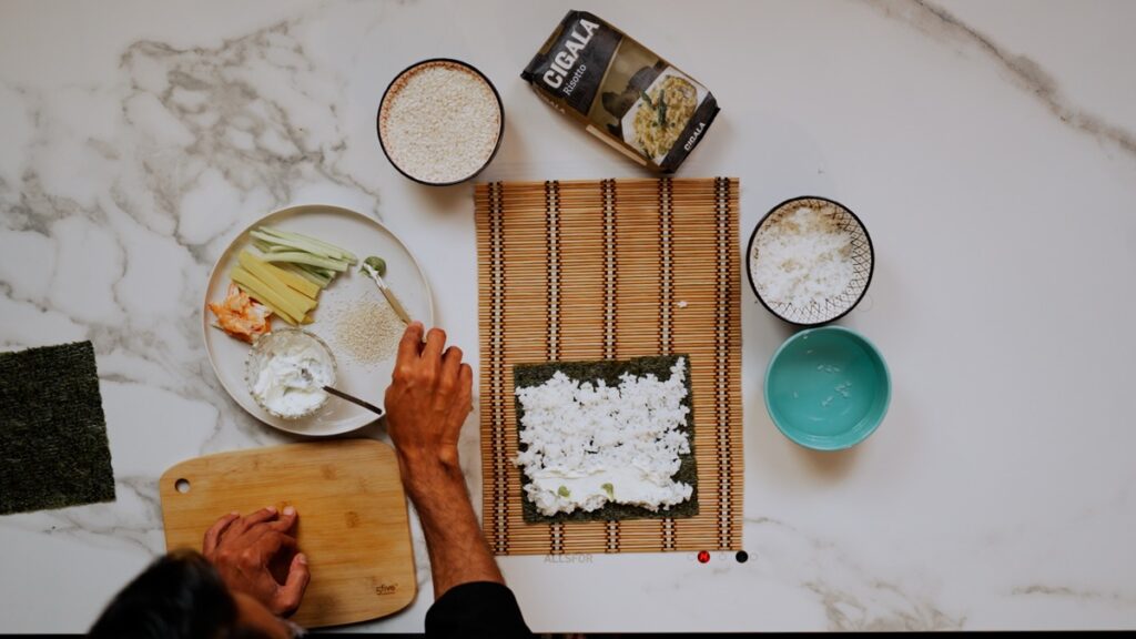 Quanto mais fina a camada de arroz, mais elegante e fácil de comer será o rolo. Menos é mais!