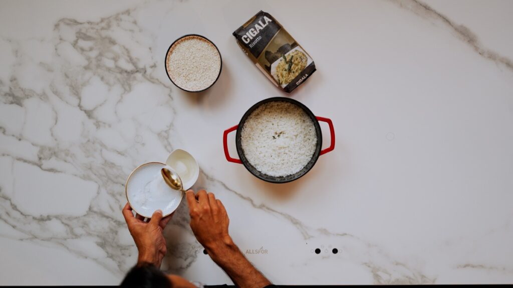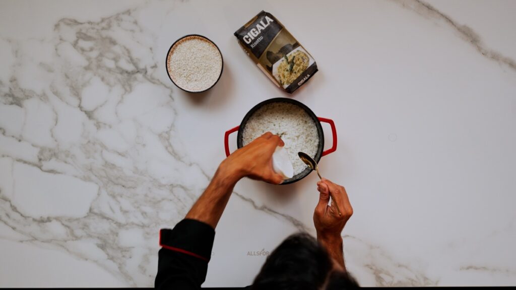 Comece por lavar bem o arroz Risotto Cigala sob água fria e esfregue suavemente com as mãos até a água ficar transparente.
