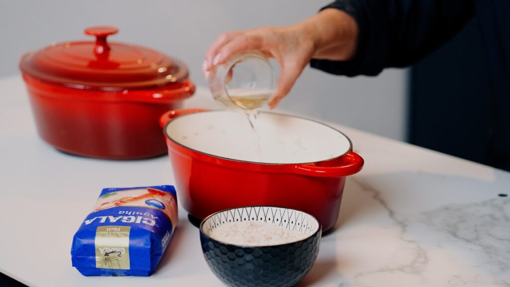 Noutra panela coloque um fio de azeite, assim que estiver quente coloque o arroz e deixe que “frite” um pouco, de seguida tempere com sal e acrescente a água temperada. O arroz branco é o acompanhamento tradicional da feijoada para criar um contraste perfeito com a riqueza do caldo.