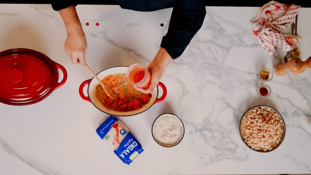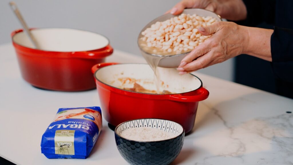 Dica profissional: Guarde cerca de 1/3 do caldo do feijão para usar durante a cozedura final para dar mais profundidade de sabor sem necessidade de ingredientes adicionais.
