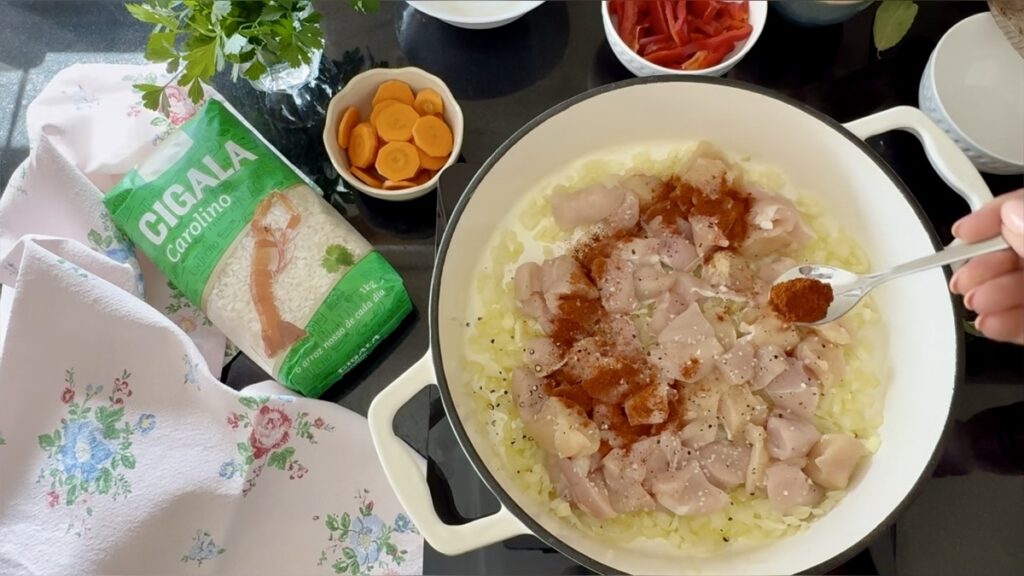 Adicione o frango, tempere com sal, pimenta e pimentão doce e deixe alourar ligeiramente, cerca de 5 minutos.