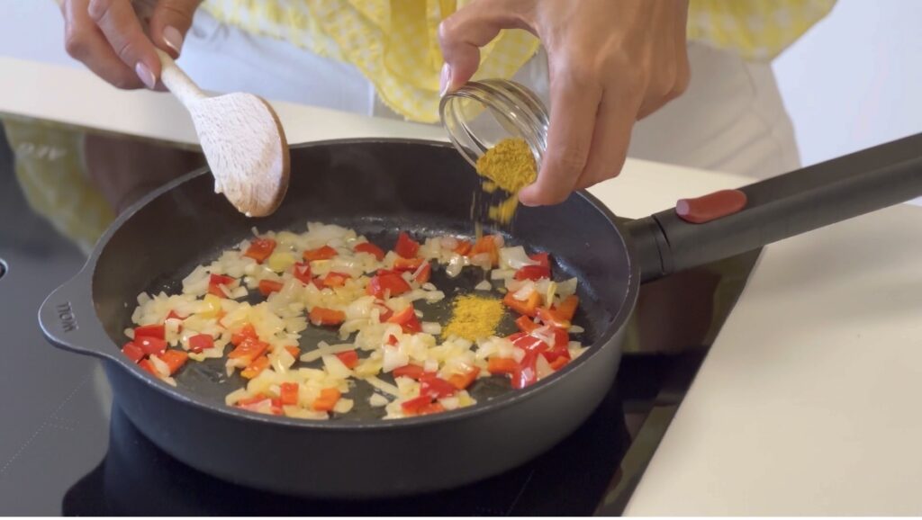 Numa frigideira, derreta a manteiga e refogue a cebola picada, o pimento vermelho e o gengibre fresco até a cebola ficar translúcida.