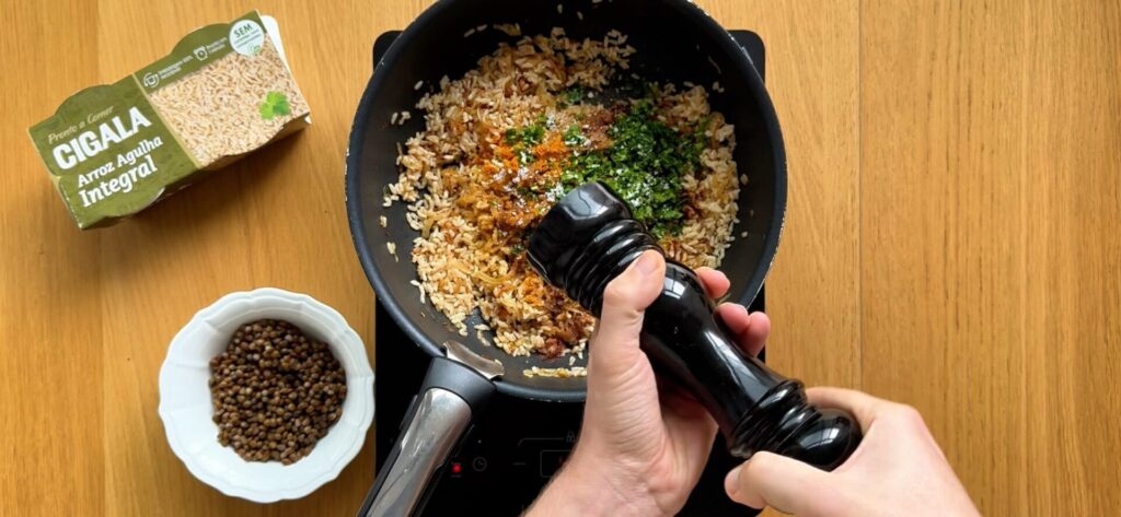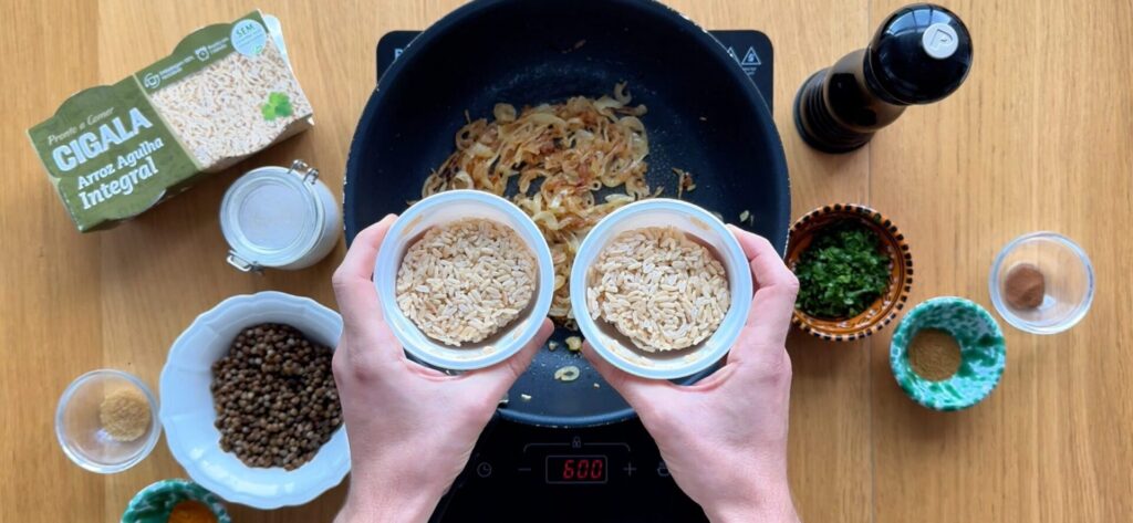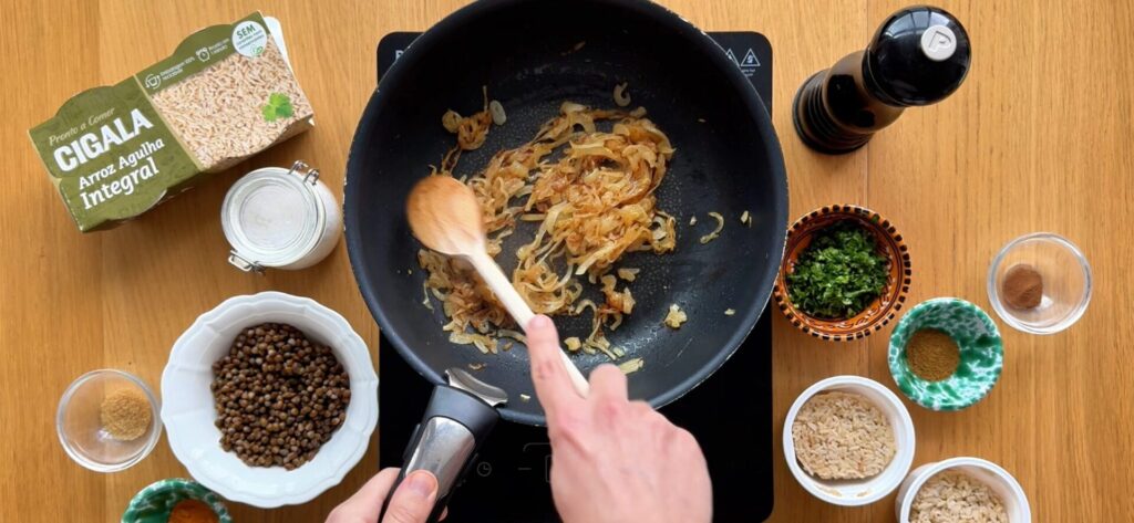 Veja o vídeo e descubra como as cebolas se transformam num caramelo dourado, os grãos de arroz integral Cigala absorvem os aromas dos cominhos e açafrão, e as lentilhas a fundirem-se suavemente com o conjunto. Num vídeo, estes momentos ganham vida e mostram como a simplicidade pode ser muito saborosa.