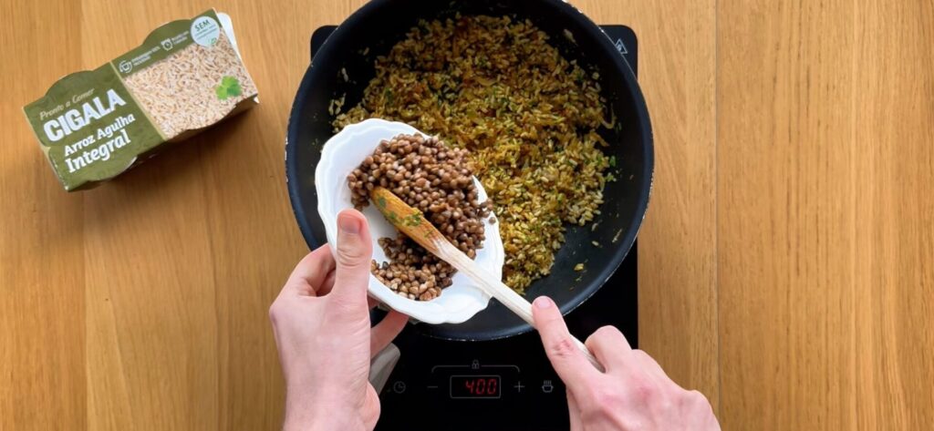 Por fim, junte as lentilhas escorridas e envolva tudo até ficar homogéneo e quente.