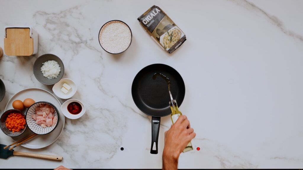 Volte a colocar o frango e envolva bem. Adicione o arroz Risotto Cigala e deixe “fritar” 1 minuto, mexendo suavemente.