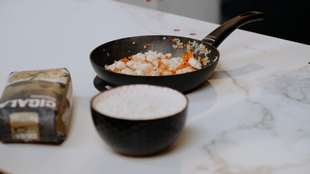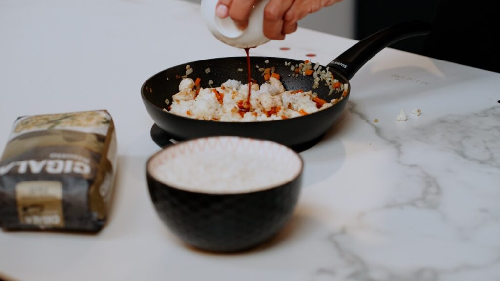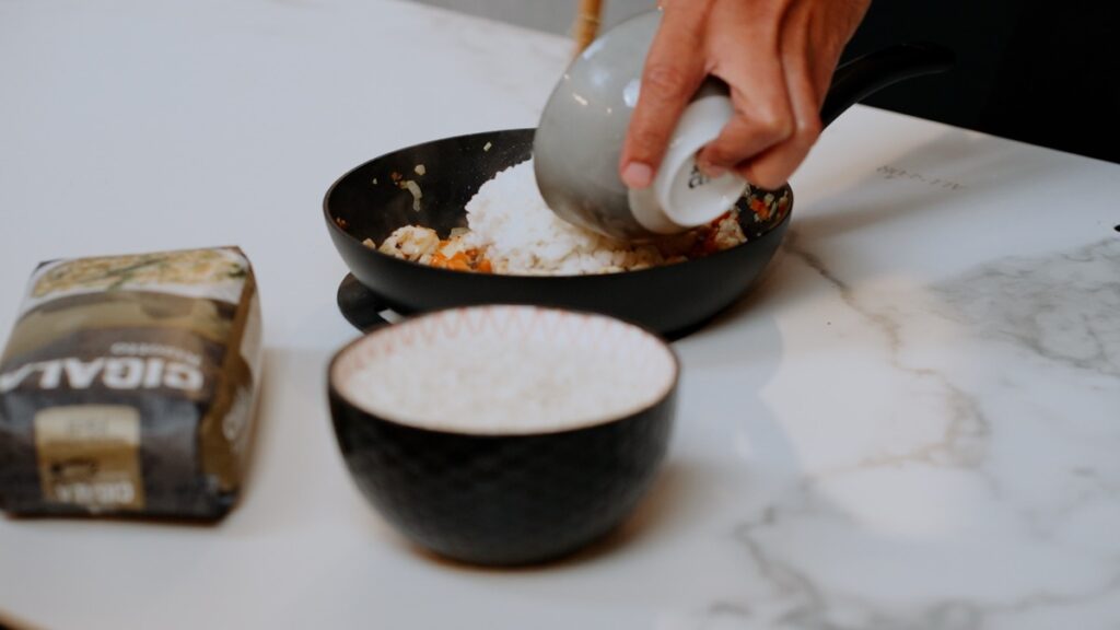 Use arroz cozido do dia anterior e não mexa em excesso durante o salteado. O arroz Risotto Cigala mantém os grãos soltos mesmo com molhos.