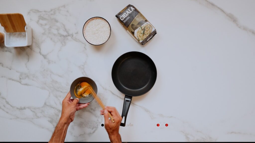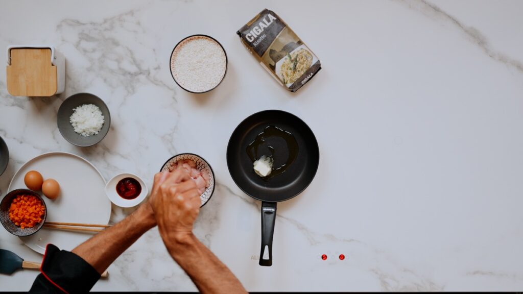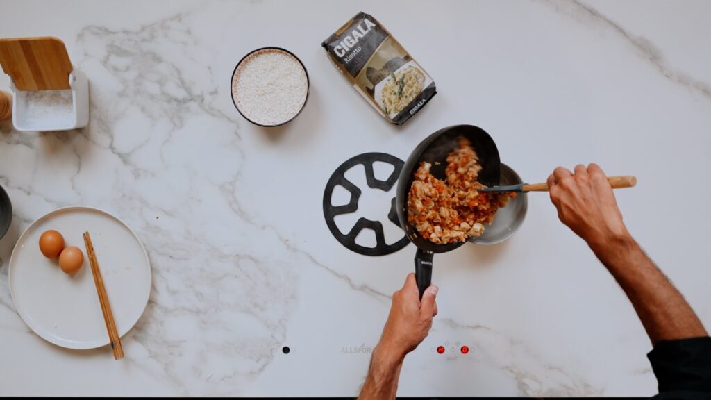 No nosso vídeo, acompanhamos cada etapa da preparação do omurice: desde o salteado aromático do frango e legumes até à técnica perfeita para uma omelete fina e jugosa. Verá como o arroz Risotto Cigala mantém os grãos soltos mesmo com ketchup, e como moldar a omelete em forma de “capa” sobre o arroz, tal como nos cafés japoneses.