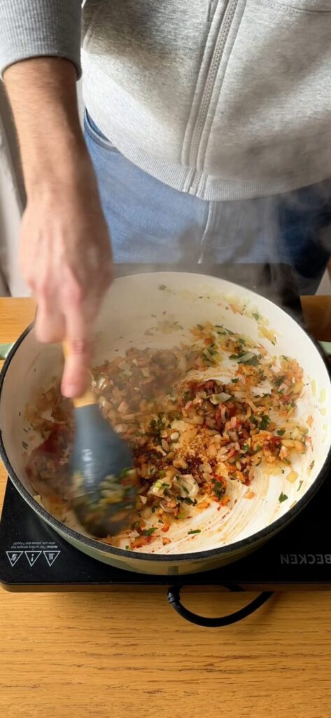 Na mesma panela, adicione 1 cebola picada, 2 dentes de alho picados, 1 colher de sopa de concentrado de tomate e coentros picados a gosto. Refogue em lume médio por 3–4 minutos, até a cebola ficar translúcida e o aroma encher a cozinha.