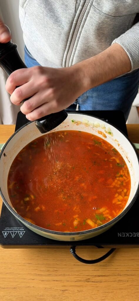 Verta 1 litro de caldo de galinha quente e tempere com 1 colher de café de pimentão doce fumado e 1 colher de café de pimenta preta moída. Envolve bem. Junte 1 chávena e meia de ervilhas congeladas, não é preciso descongelar.