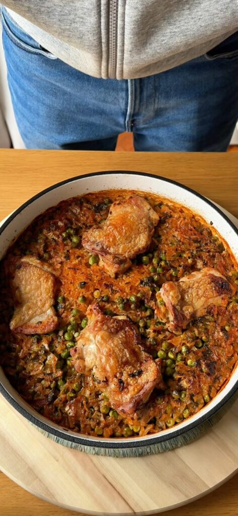 Ideal para famílias, refeições de fim de semana ou até para impressionar convidados sem complicação, este prato une frango suculento, ervilhas doces e arroz perfeitamente cozido tudo numa só travessa.