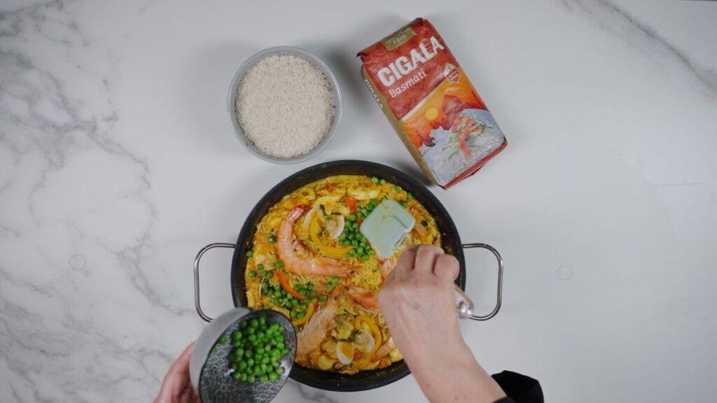 A paella vai formar uma leve crosta dourada no fundo, conhecida como socarrat, que dá um sabor único ao prato.